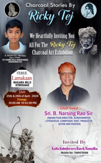 హైదరాబాద్: నాగర్‌కర్నూల్ జిల్లాకు చెందిన ఒక 12 ఏళ్ల బాల మేధావి తన అద్భుత చిత్రకళా నైపుణ్యంతో రాజధాని నగరాన్ని పలకరించబోతున్నాడు. కల్వకుర్తి నివాసి, ప్రభుత్వ ఉపాధ్యాయ దంపతులు కట్టా కోటేశ్వరరావు – సమతల కుమారుడైన రిక్కీ తేజ్, తన బొగ్గు గీతల (Charcoal Art) మాయాజాలాన్ని ప్రదర్శించేందుకు సిద్ధమయ్యాడు. ‘చార్కోల్ స్టోరీస్’ పేరుతో ఈనెల 25, 26 తేదీల్లో హైదరాబాద్‌లోని లమాకన్ (Lamakaan) వేదికగా భారీ చిత్రకళా ప్రదర్శన ఏర్పాటు చేయబడింది.