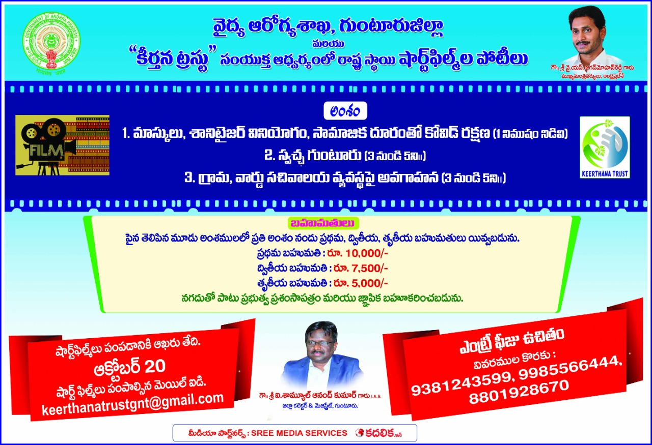గుంటూరు జిల్లా వైద్య,ఆరోగ్యశాఖ మరియు కీర్తన ట్రస్టు సంయుక్త ఆధ్వర్యంలో నిర్వహిస్తున్న రాష్ట్రస్థాయి షార్ట్ ఫిల్మ్ లకు సంబంధించిన వాల్ పోస్టర్ లను జిల్లాకలెక్టర్ ఐ.శామ్యూల్ ఆనంద్ కుమార్ ఆవిష్కరించారు. శనివారం ఆయన స్థానిక వెంకటేశ్వర విజ్ఞాన మందిరంలో కోవిడ్-19 అవగాహన కార్యక్రమంలో షార్ట్ ఫిల్మ్ పోస్టర్లను ఆవిష్కరించారు. ప్రధానంగా మూడు ఆంశాలపై ఈ పోటీలు నిర్వహిస్తున్నట్లు కలెక్టర్ వెల్లడించారు. మాస్కులు, శానిటైజర్ వినియోగం, భౌతికదూరం పాటింపుతో కోవిడ్-19 నుంచి రక్షణ అనేది ఒక నిముషం నిడివితో మొదటి అంశంపై షార్ట్ ఫిల్మ్ తీయాలన్నారు. అదేవిధంగా స్వచ్ఛ గుంటూరు అనే అంశాన్ని మూడు నుంచి ఐదు నిముషాల నిడివితో ఉండాలన్నారు. ఇక, మూడో అంశంగా గ్రామ, వార్డు సచివాలయ వ్యవస్థపై అవగాహన చేస్తూ మూడు నుంచి ఐదు నిముషాల నిడివితో చిత్రీకరించి పోటీలకు పంపాలన్నారు.