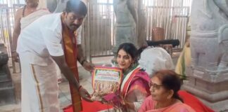 హీరోయిన్ అనన్య నాగళ్ళకు తీర్థ ప్రసాదాలు అందచేసిన తాతయ్యగుంట అమ్మవారి గుడి చైర్మన్ మహేష్...