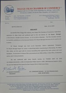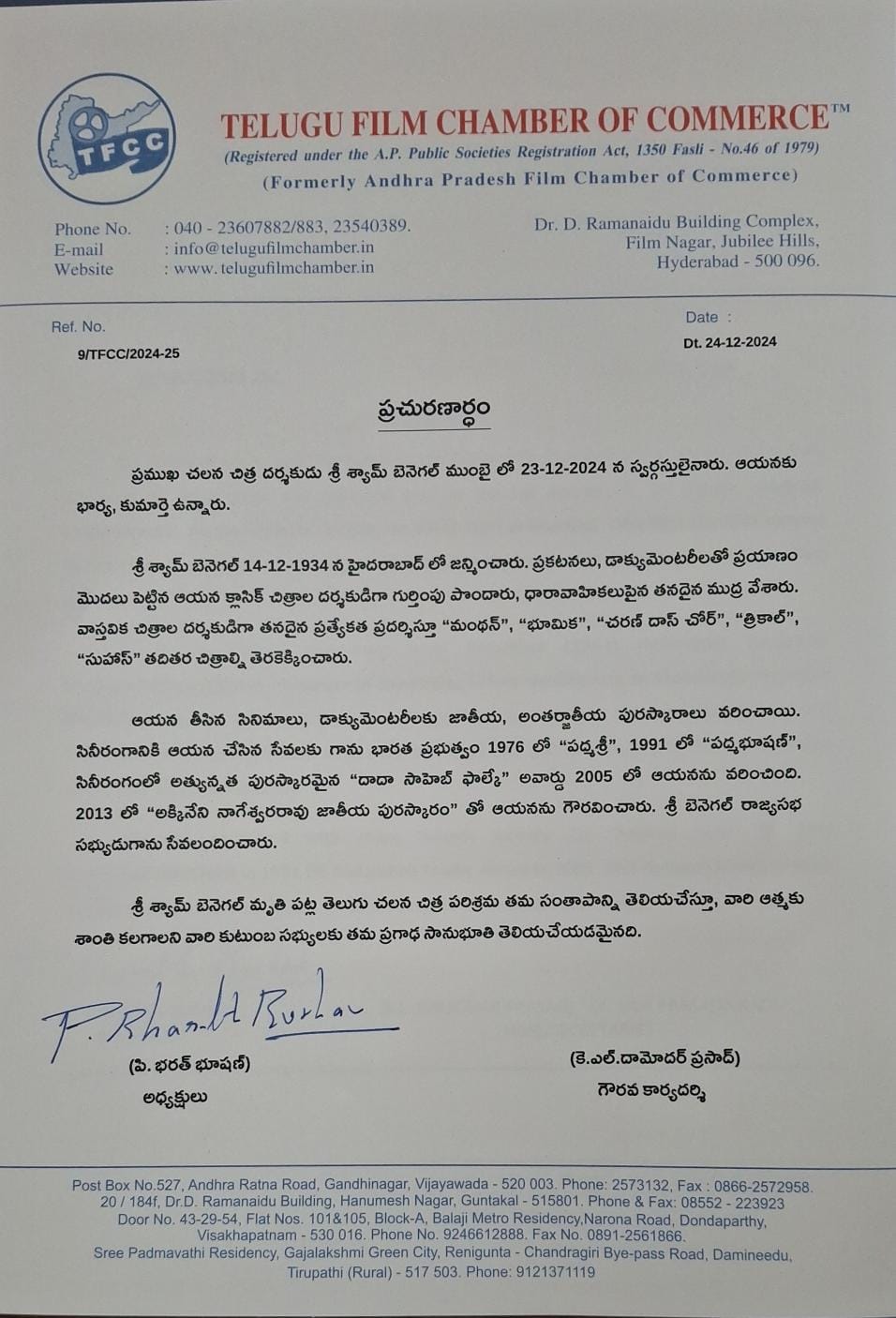 శ్రీ శ్యామ్ బెనెగల్ మృతి పట్ల తెలుగు చలన చిత్ర పరిశ్రమ తమ సంతాపాన్ని తెలియచేస్తూ, వారి ఆత్మకు శాంతి కలగాలని వారి కుటుంబ సభ్యులకు తమ ప్రగాఢ సానుభూతి తెలియచేయడమైనది.